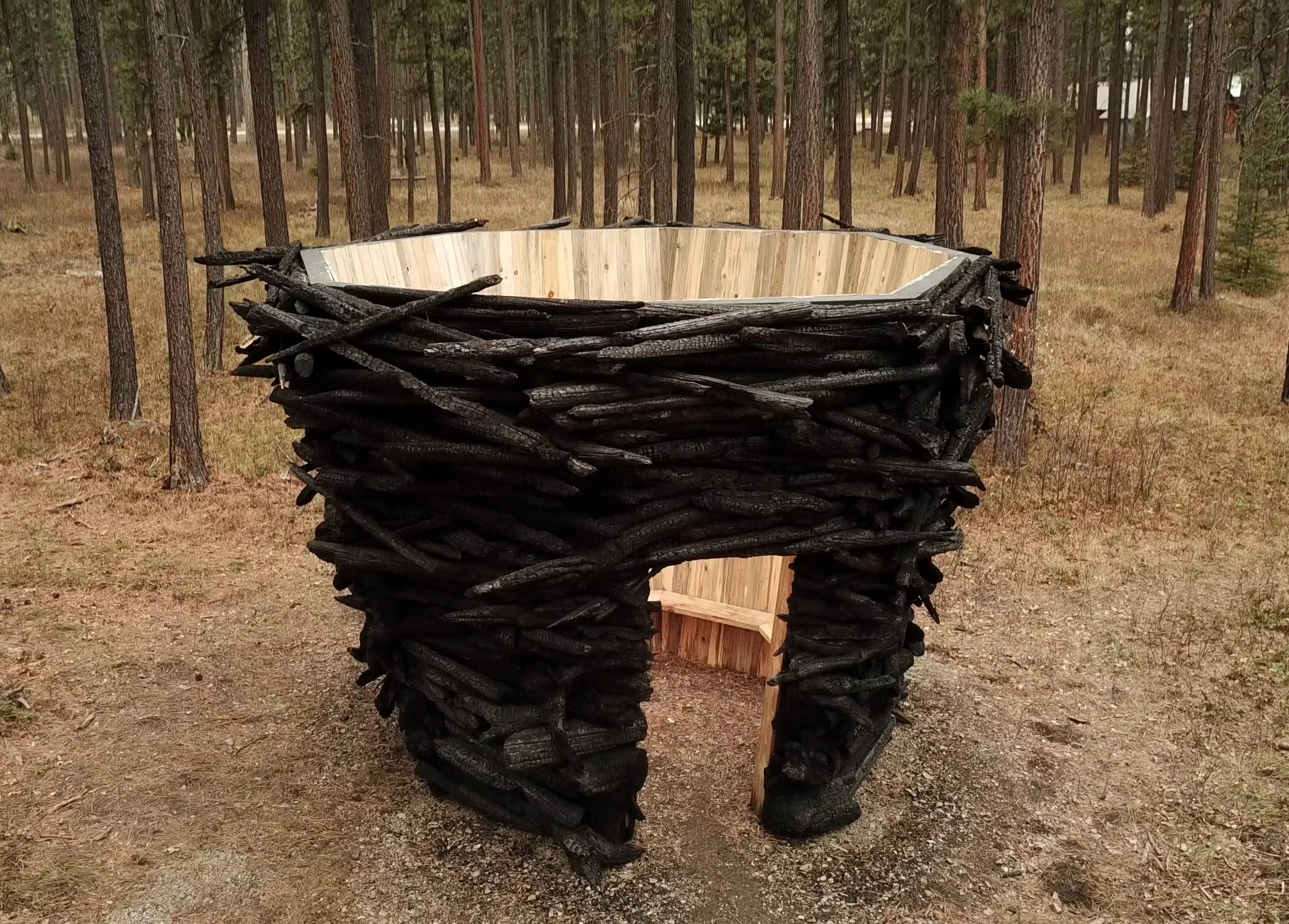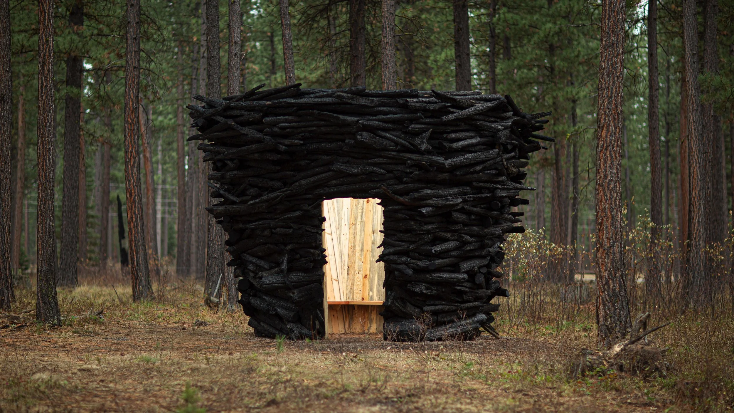 Material for this project was burned by wildfire and gathered by community members who fought fire to save their lives. Clearing embodies the stories of resilient people who battle wildfires, physical and metaphorical, and provides a contemplative space for all who enter.