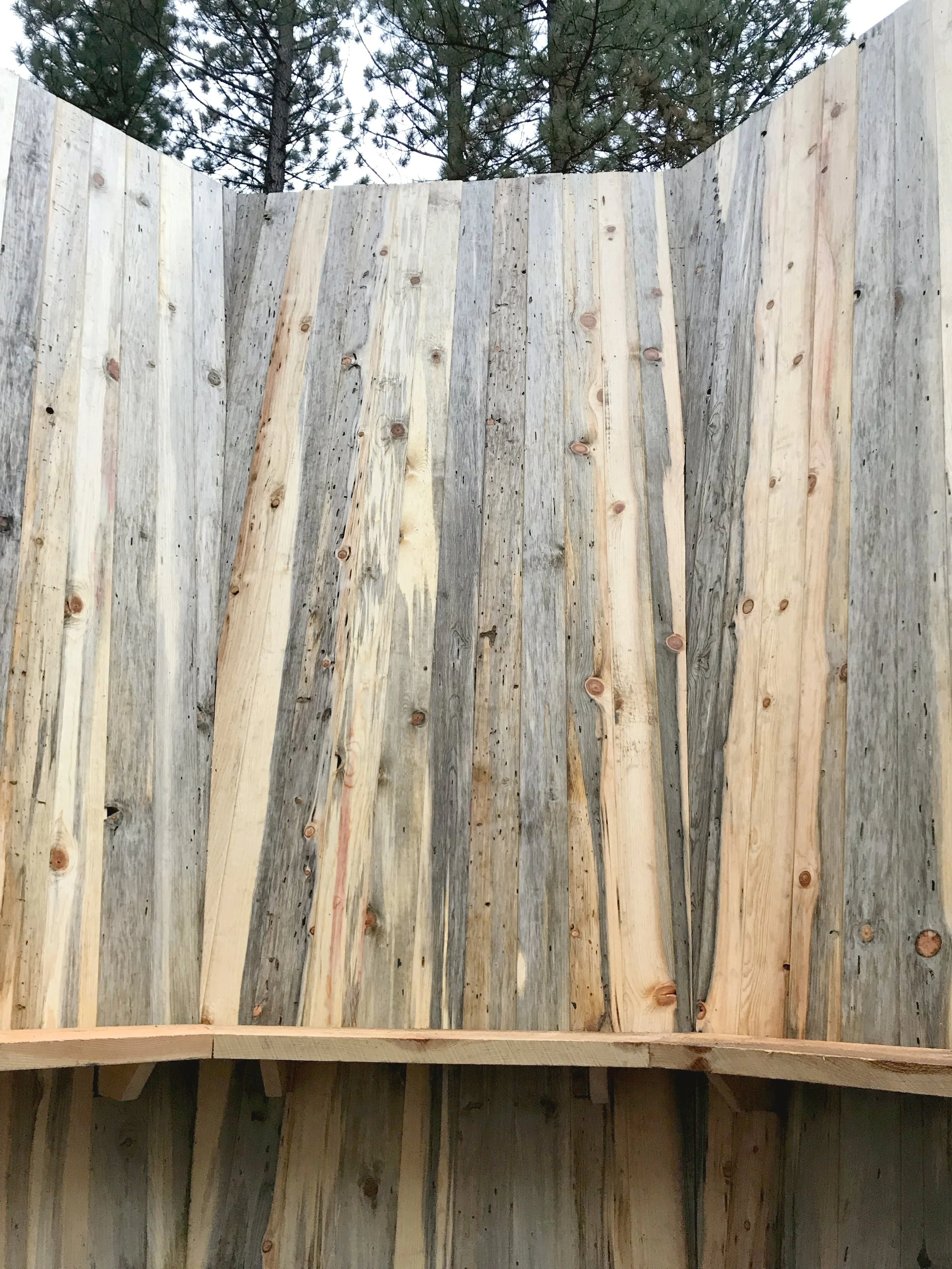 The interior of Clearing is paneled with Montana Blue Pine and provides a perimeter bench for viewers to rest. The gently angled walls invite viewers to lean back and naturally lifts their gaze upward. The vertical wood paneling mimics the view of stretching pine trees.