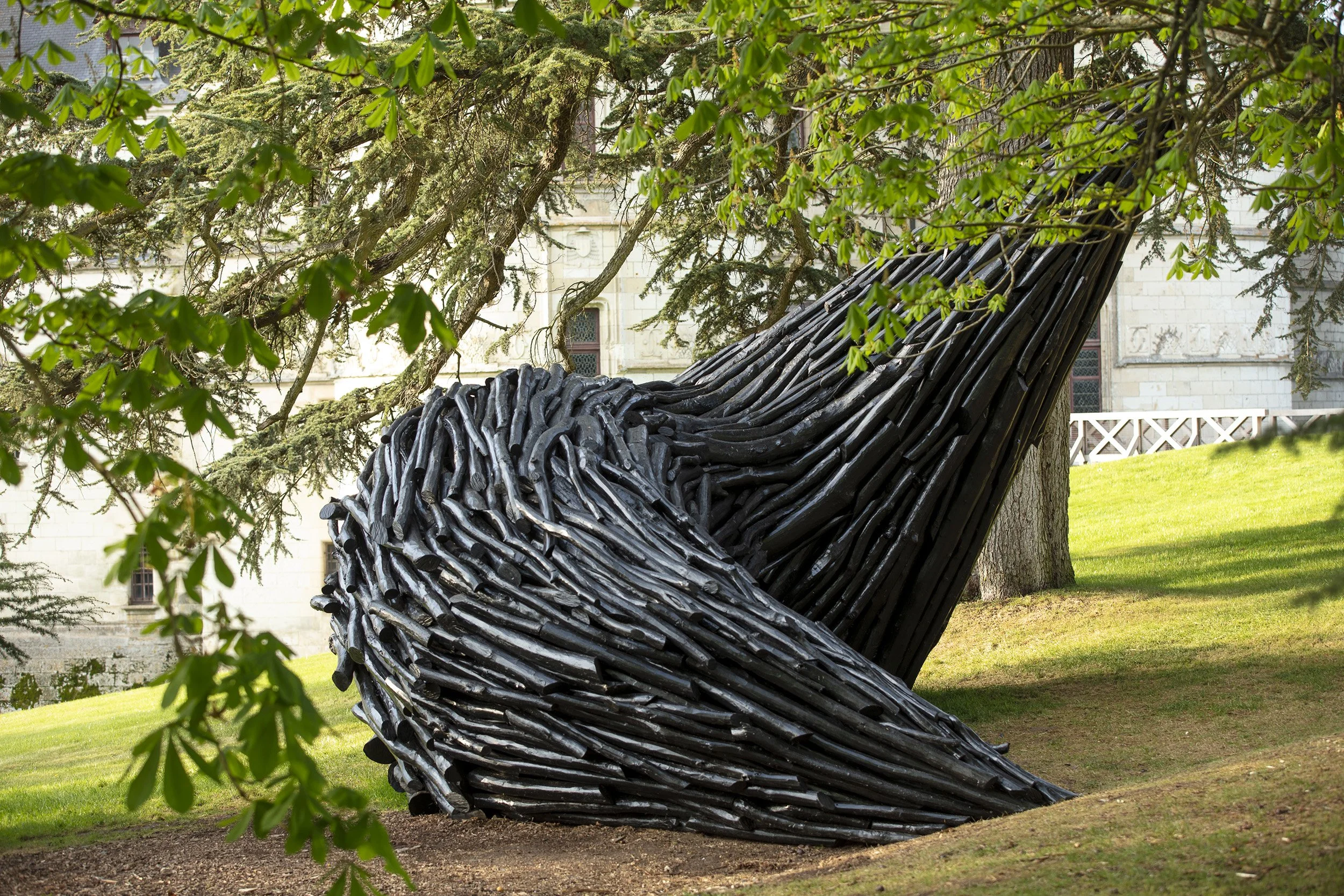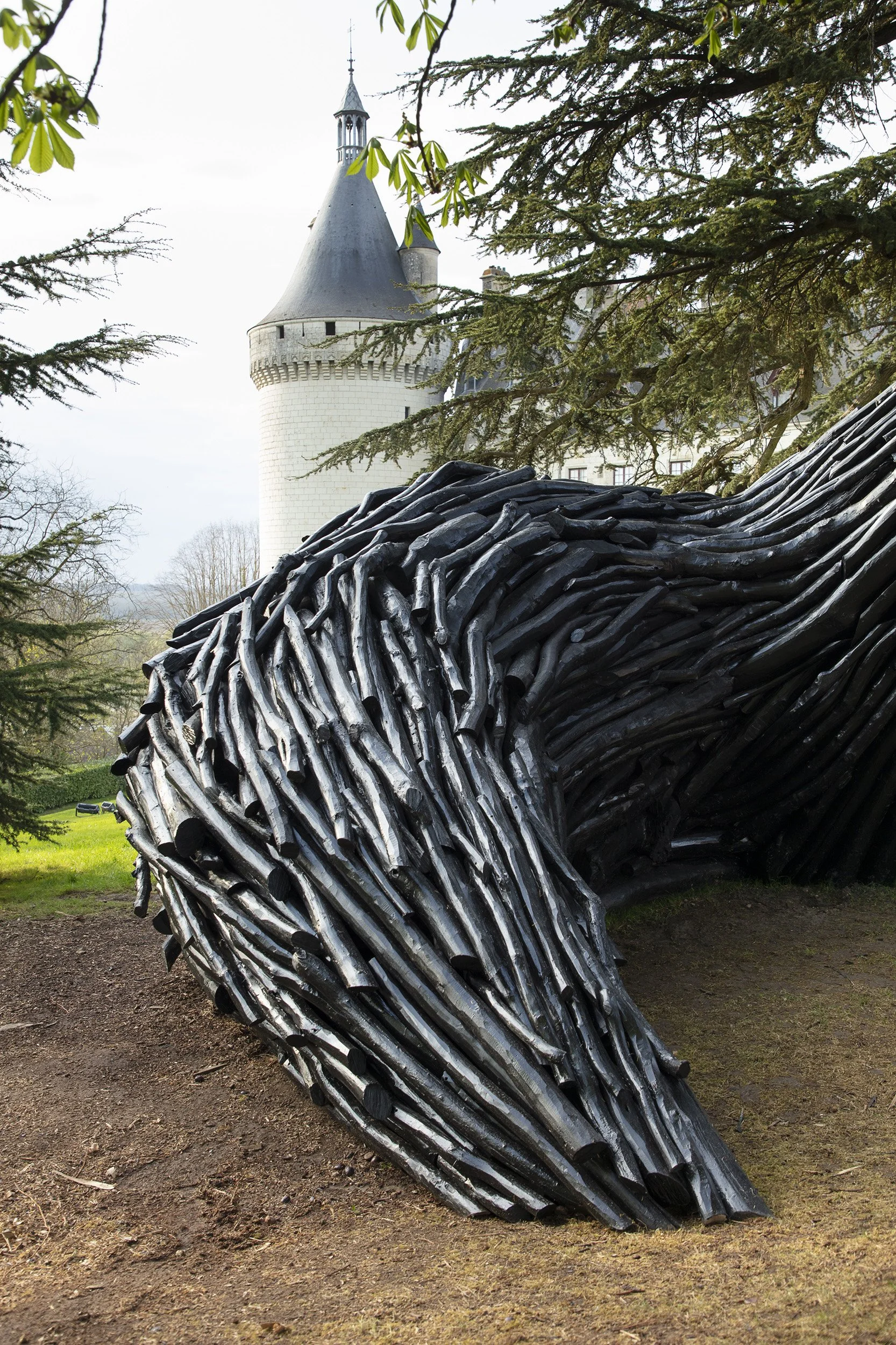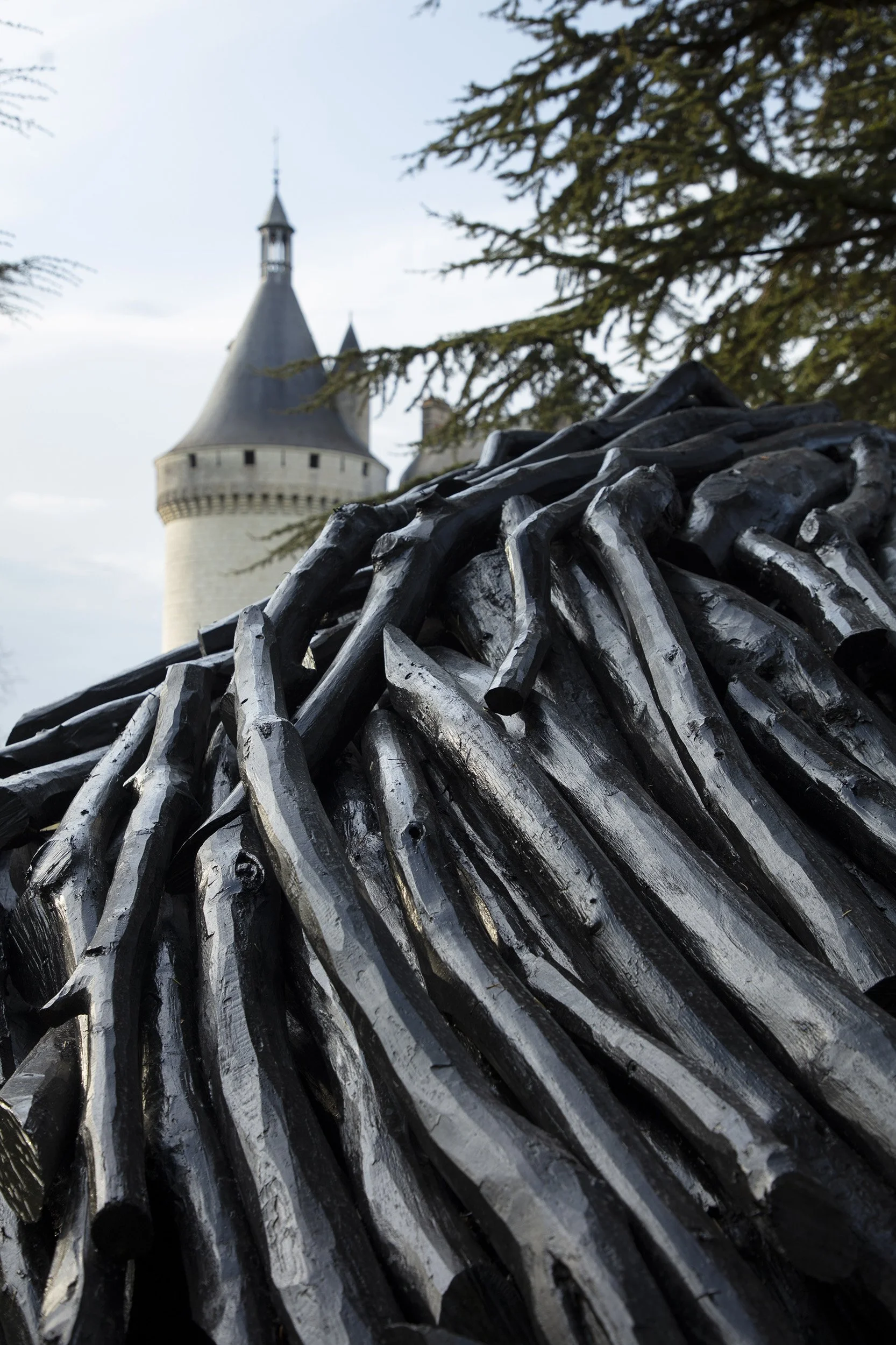 Flux is a large-scale installation between the historic castle and stables of Chaumont-sur-Loire. It is constructed of blackened branches, taken from trees in the park and along the Loire River. In addition to the location between two historic buildings, Flux is nestled beneath sweeping cedar trees, offering partial glimpses beckoning viewers to come closer. Flux echoes the gesture of the cedars- deeply rooted and reaching up. Though the wood is dense, the form belies these materials and rather conveys movement like the flow of water or wind.