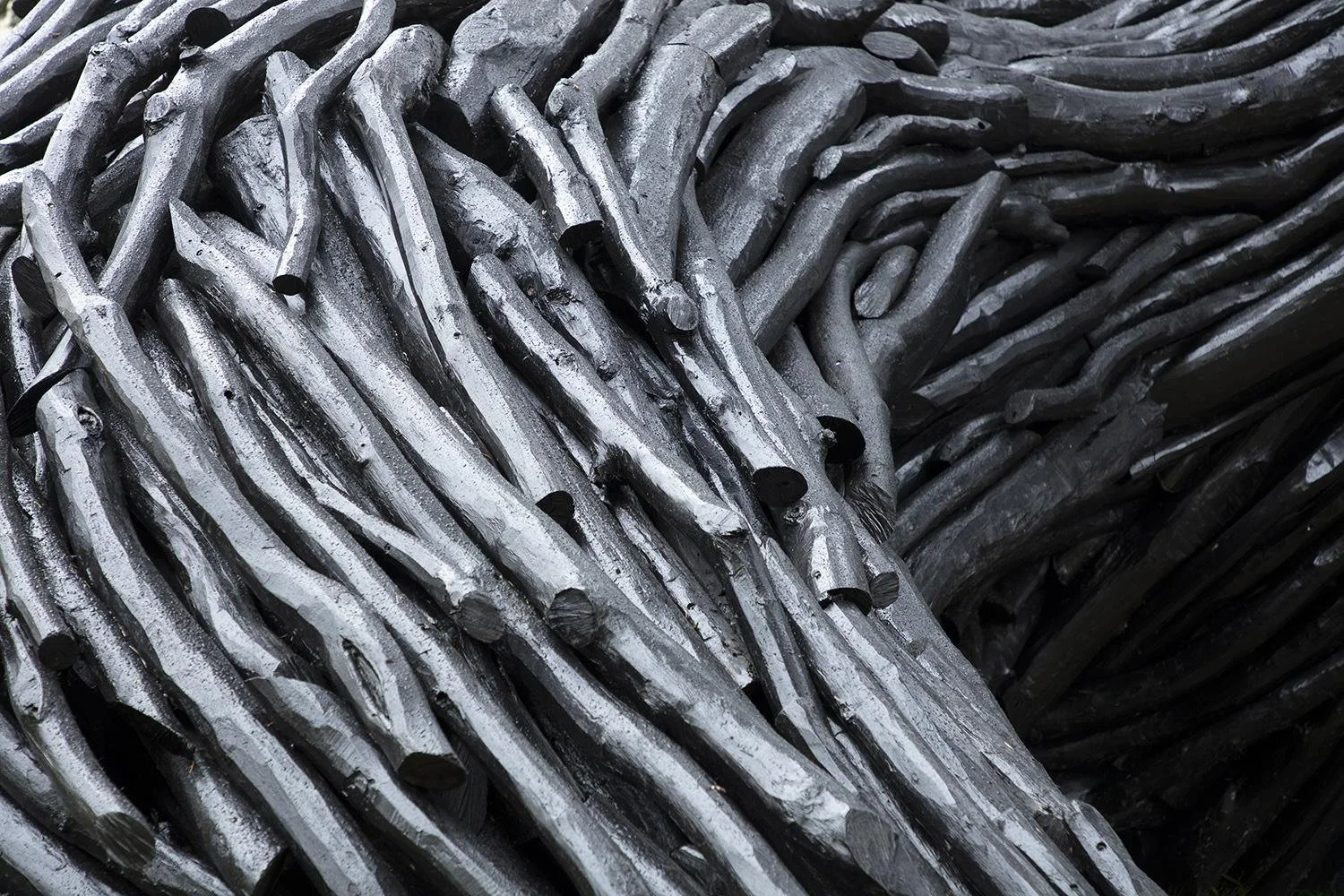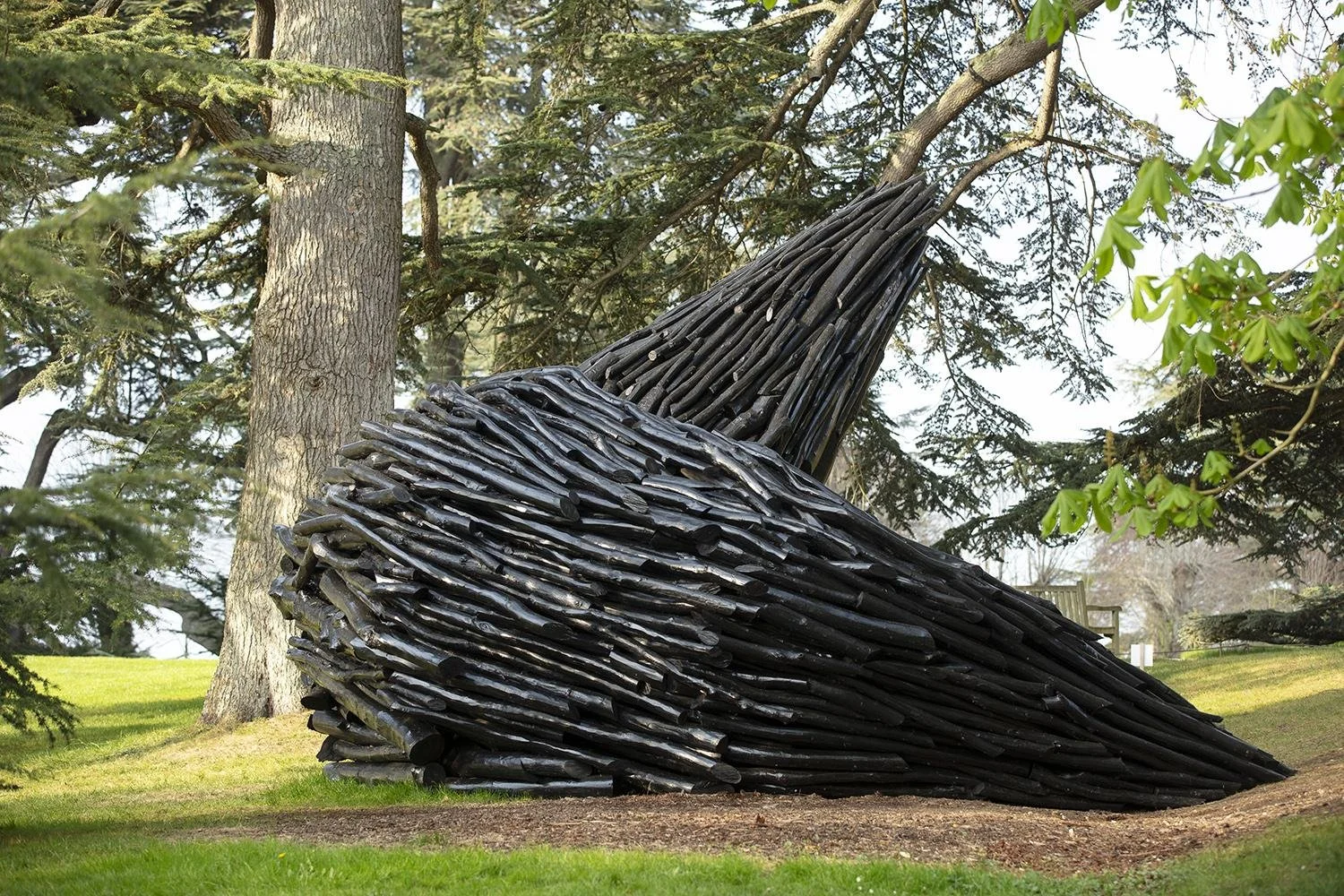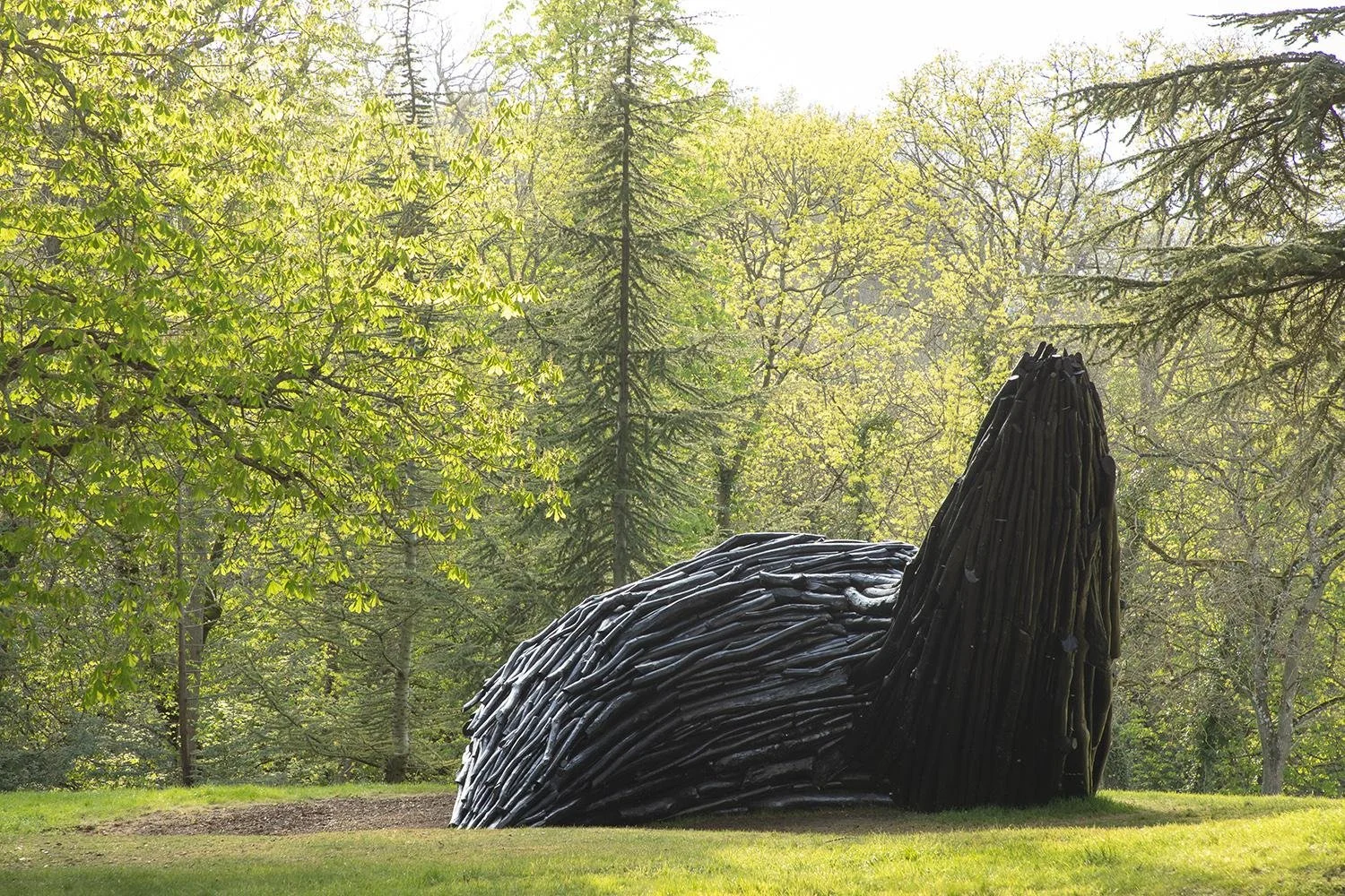 Flux is a large-scale installation between the historic castle and stables of Chaumont-sur-Loire. It is constructed of blackened branches, taken from trees in the park and along the Loire River. In addition to the location between two historic buildings, Flux is nestled beneath sweeping cedar trees, offering partial glimpses beckoning viewers to come closer. Flux echoes the gesture of the cedars- deeply rooted and reaching up. Though the wood is dense, the form belies these materials and rather conveys movement like the flow of water or wind.