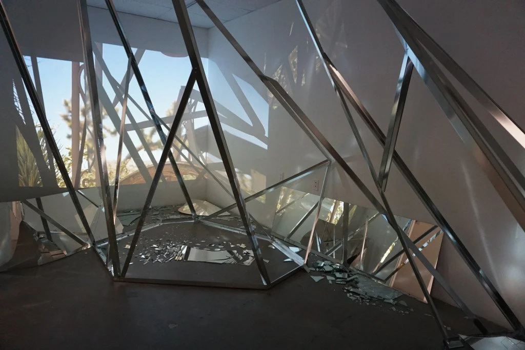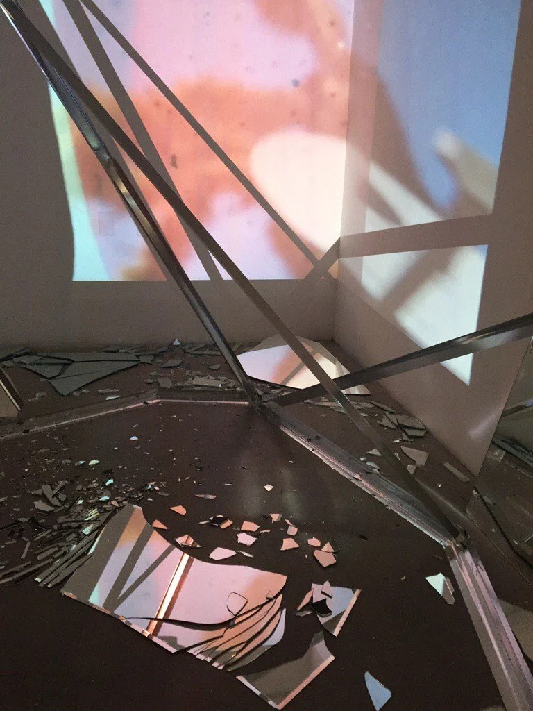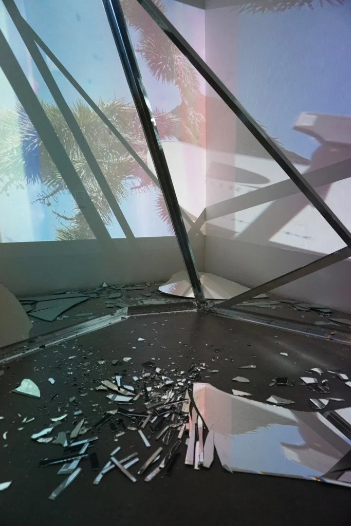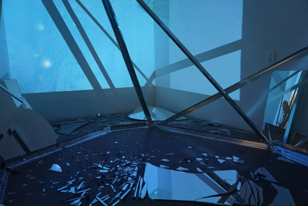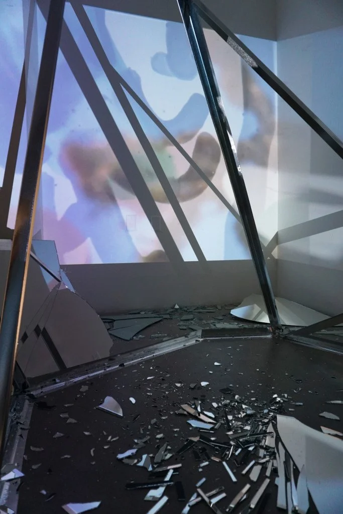 The film disperses across the room, reflecting at angles off of broken glass, and extending through geometric steel forms. Sounds of breaking glass and glockenspiel fill the space, as colors and images shift, enveloping the viewer.